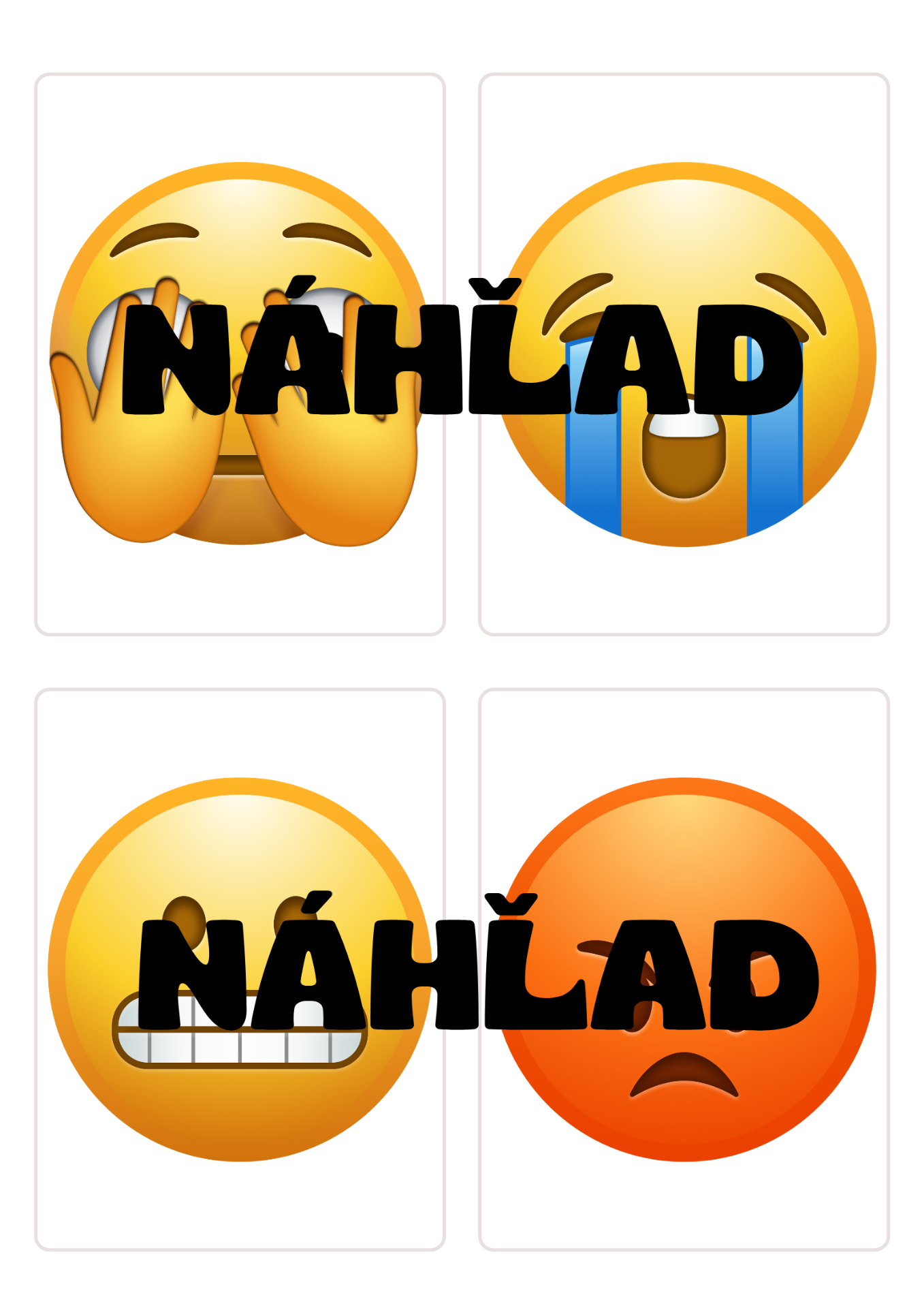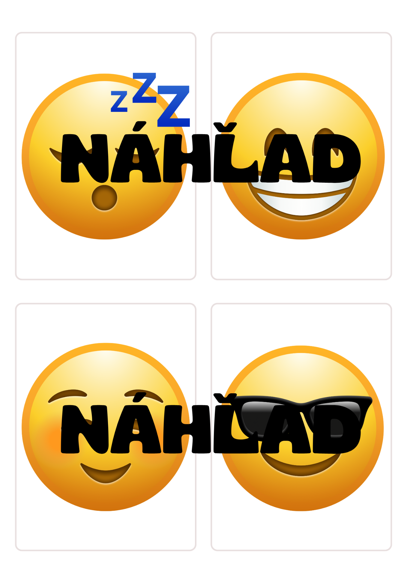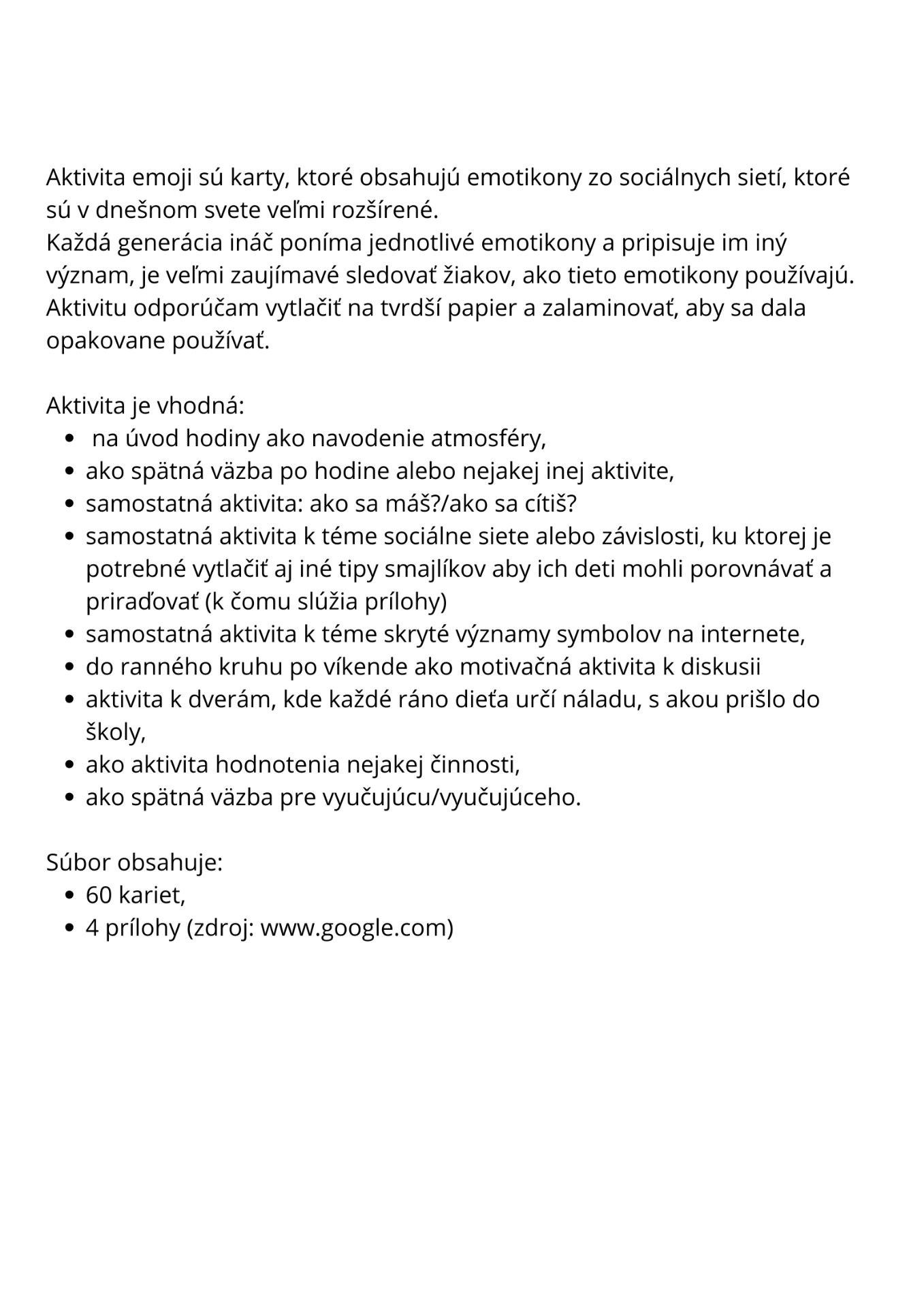 Aktivita EMOJI obsahuje 60 kariet so smajlíkmi, ktoré sa dajú používať na rôzne aktivity a spôsoby. Prosím, prečítajte si sprievodnú stranu v ukážkach.