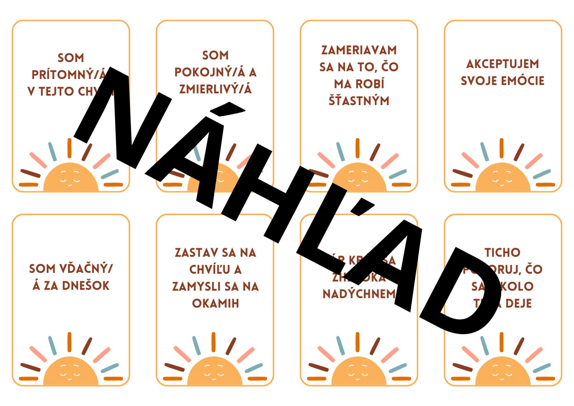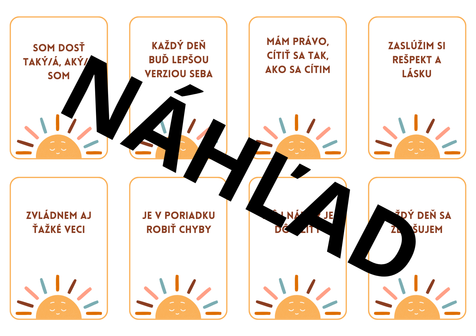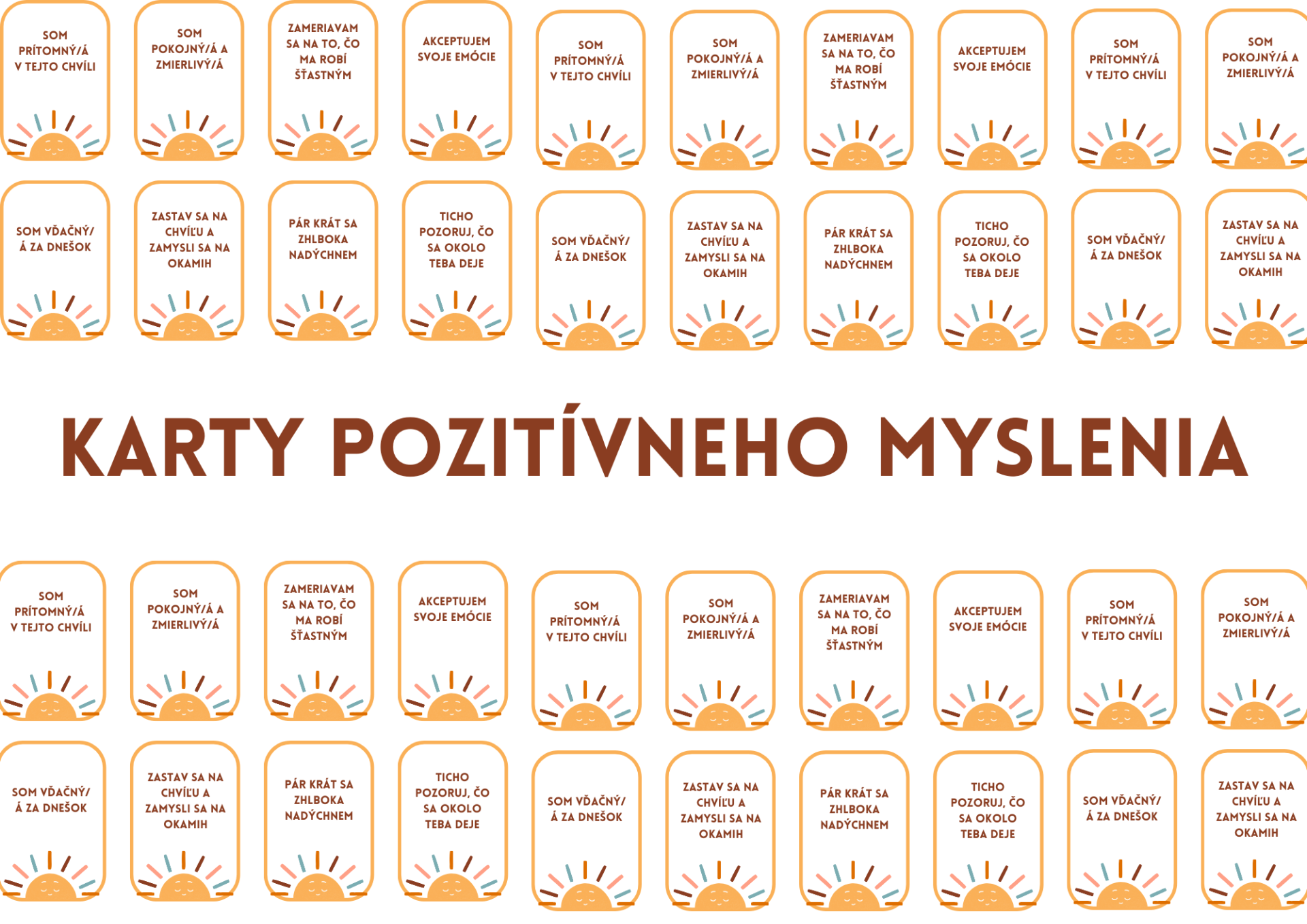 48 kartičiek s krátkymi frázami, ktoré podporí pozitívne myslenie u žiakov druhého stupňa a strednej školy. Využiteľné pri rôznych aktivitách.